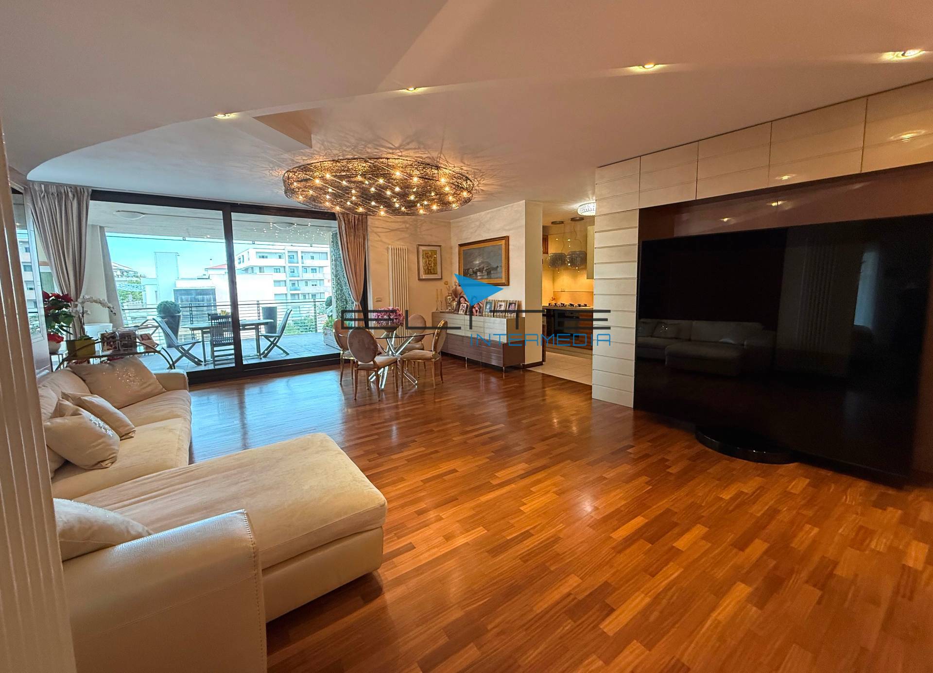 L'ingresso introduce su un ampio ed elegante living, progettato come un vero spazio di accoglienza e convivialità, impreziosito da arredi su misura realizzati con materiali di pregio di altissima fattura e qualità, studiati per valorizzare l'ambiente, che regala una sensazione immediata di equilibrio e armonia.
